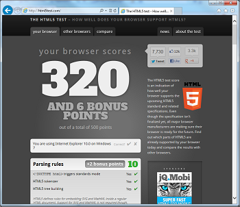 The HTML benchmark score is an indication of how well a browser supports HTML 5 features. The maximum score is 500 points, but no browser reaches this yet.